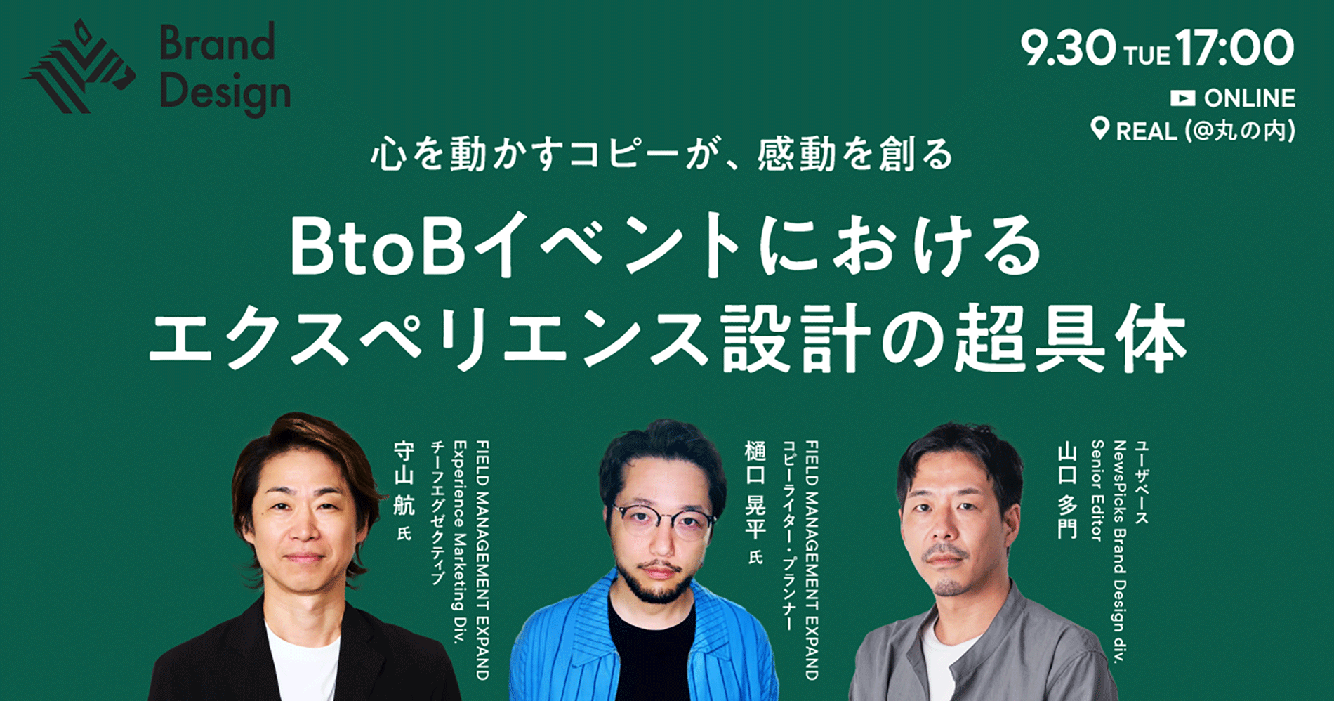 9月30日(火)開催のNewsPicks Brand Design主催イベント「心を動かすコピーが、感動を創る。BtoBイベントにおけるエクスペリエンス設計の超具体」に、Experience Marketing部門 チーフエグゼクティブの 守山航と、コピーライター/プランナーの 樋口晃平が登壇いたします。